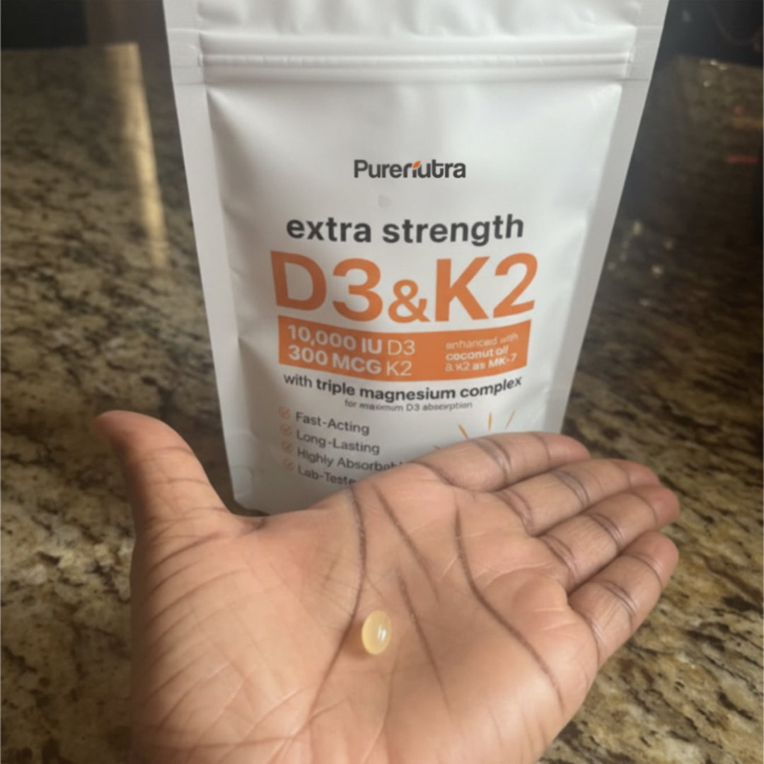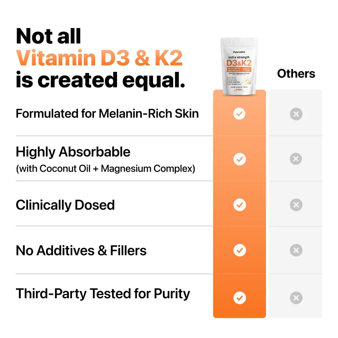 Many supplements don’t absorb well, but this D3 + K2 formula is made to work smoothly with your body. Because low Vitamin D levels are common — especially in people with deeper skin tones — this blend was created to help support your daily wellness in a way that actually feels noticeable.